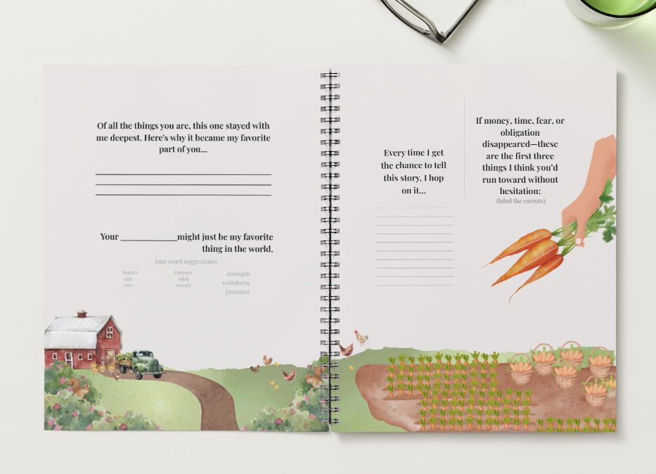 - Includes affirming prompts, emotional checkboxes, creative cues, and quiet reflections