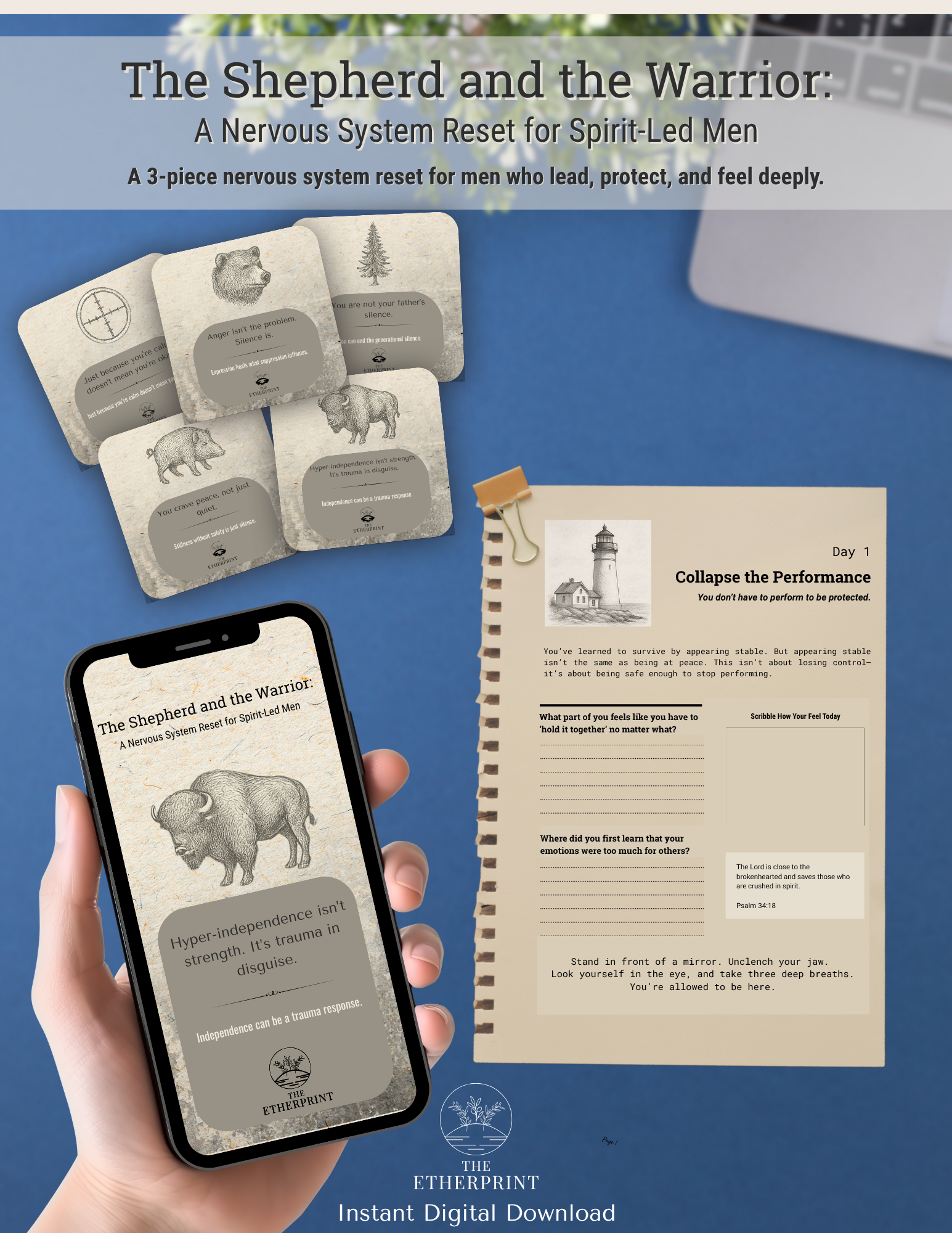 The Shepherd and the Warrior: A Nervous System Reset for Spirit-Led Men is a three-part digital healing experience, designed to gently support regulation, self-trust, and somatic awareness through every kind of overwhelm. Whether you're navigating trauma, chronic burnout, or emotional shutdown, these tools meet you where you are — quietly and powerfully.